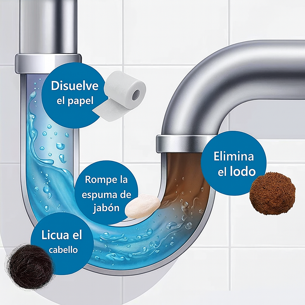 💥 Disuelve obstrucciones de cabello, grasa y residuos.